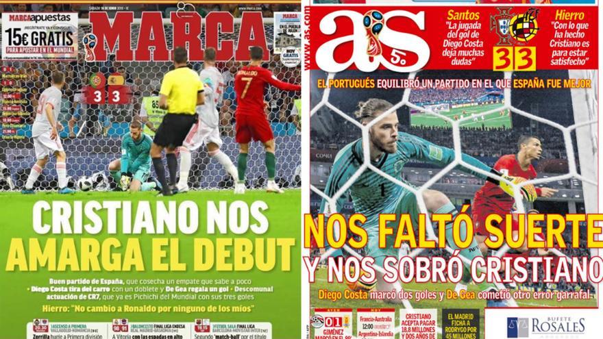 Para o Marca, “o empate não basta” no jogo de estreia da Espanha, em que o avançado Diego Costa “saiu na frente com um duplo” e em que David de Gea “deu um golo”, perante uma “grande exibição de CR7, que já é Pichichi com seus três gols.”