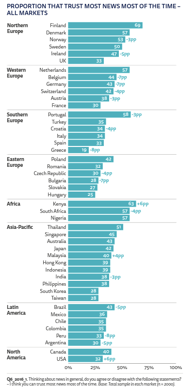 Em termos desta confiança, à frente de dois portugueses, a Finlândia lidera o pódio (69%), seguida pela Quénia (63%). Os países com maior grau de polarização política revelam os menores números de confiança nas notícias, como os Estados Unidos da América (32%), Argentina (30%), Hungria (25%) e Grécia (19%).